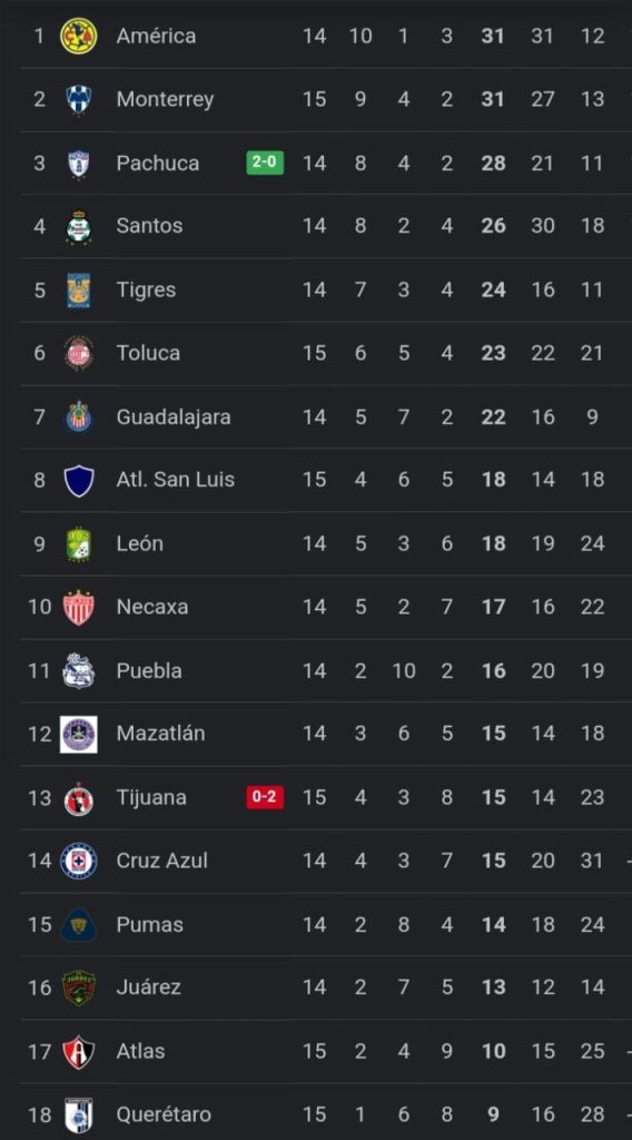 Después de 14 jornadas América después de pasar por enésima de su cliente más cercano el Necaxa al vencerlos de visita por marcador de 1-2 y Monterrey al vencer a los xolos de tijuana sigen en la zona alta las águilas encabezan por diferencia de goles 31 a favor contra 27 del sublider con 31 unidades.