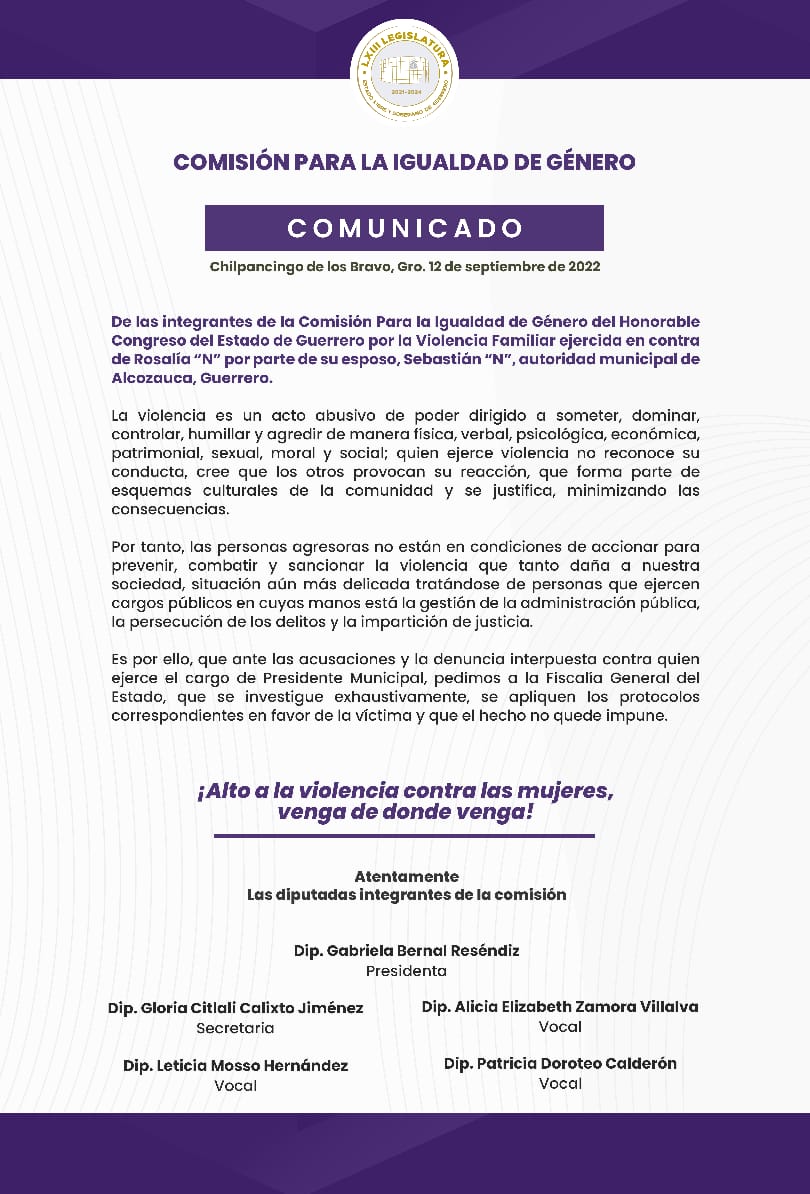 Al respecto, las integrantes de la Comisión para la Igualdad de género, que preside, Gabriela Bernal Reséndiz, publicaron un comunicado en el que señalan que las personas agresoras no están en condiciones de accionar para prevenir, sancionar y combatir la violencia que tanto daña a la sociedad. “Es por ello que ante las acusaciones y la denuncia interpuesta contra quién ejerce el cargo de presidente municipal (de Alcozauca) pedimos a la Fiscalía General del Estado que se investigue exhaustivamente, se apliquen los protocolos correspondientes a favor de la víctima, y que el hecho no quede impune”, señala el documento firmado por las diputadas Gabriela Bernal Reséndiz, Alicia Zamora Villalva, Citlali Calixto Jiménez, Leticia Mosso Hernández y Patricia Doroteo Calderón.