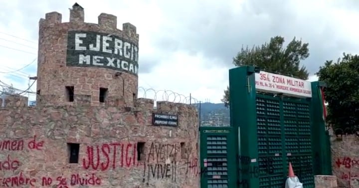 Normalistas de Ayotzinapa vandalizaron las instalaciones de la 35 Zona Militar, tras lanzar bombas molotov y petardos al interior de las instalaciones castrenses, como parte de la jornada de protestas, en el marco del octavo aniversario de la desaparición de los 43 estudiantes de esa normal.