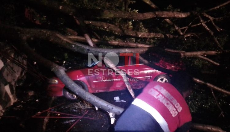 Debido a las lluvias y fuertes vientos de los últimos días, un árbol cayó sobre dos vehículos en el estacionamiento del hotel Jacarandas de esta ciudad.