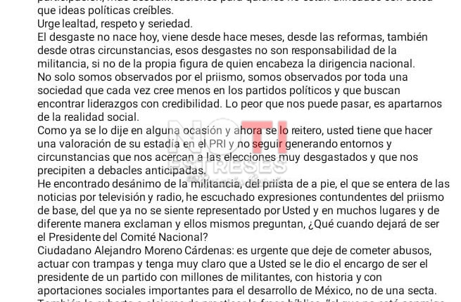 El priista envió su renuncia al Consejo Político Nacional al dirigente nacional del tricolor, Alejandro Moreno Cárdenas, a quien le dice que su separación del Consejo es un acto de “congruencia con mis convicciones políticas, democráticas y morales”, y agrega: “No puedo convertirme en observador de abusos, faltas de respeto y de trampas”.