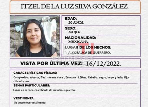 El sistema Alerta Violeta también mantiene una alerta activada por la desaparición de Itzel de la Luz Silva González, de 20 años de edad, desaparecida en Alcozauca, municipio de la región de La Montaña; de complexión robusta, tez Morena clara, con estatura de 1.60 metros, cabello negro, largo y lacio y ojos café obscuros.