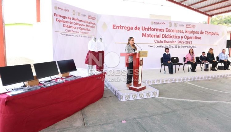 La mandataria estatal y la Secretaria de Educación Pública, Leticia Ramírez, visitaron algunos centros educativos de Taxco como la Escuela Primaria “Amado Nervo” y el Jardín de Niños “Rosaura Zapata”, para conocer las necesidades de las escuelas y hacer entrega de uniformes, equipos de cómputo, mobiliario, así como material didáctico, operativo y deportivo como parte de la nueva escuela mexicana.