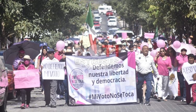 Los participantes de la marcha portaron lonas y pancartas con textos en defensa del INE y corearon consignas como “El INE no se toca”, “Solo a eso vine, a defender al INE”.