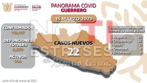 En el informe técnico diario sobre el estado de la pandemia en Guerrero, la SSG informó que al 14 de marzo se acumulan 119,107 casos confirmados y 6,879 defunciones, así mismo la dependencia informó que el estado en la última semana presenta un leve incremento en casos activos.