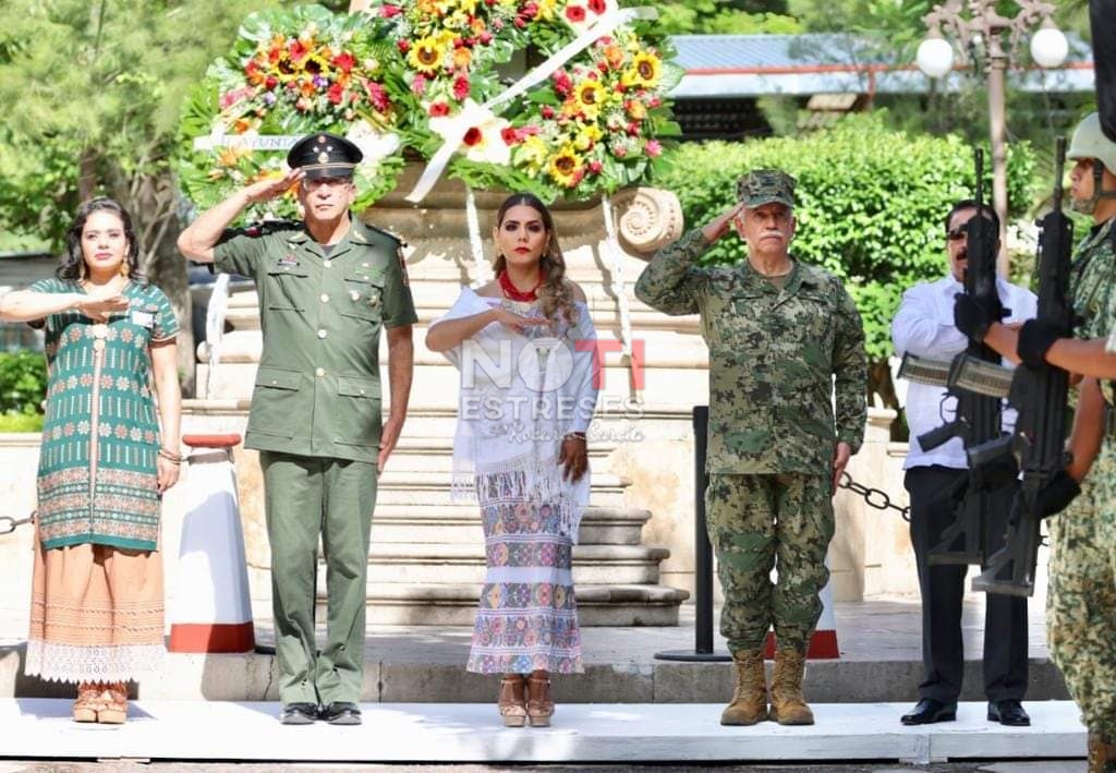 Previo al inicio del desfile cívico – militar, acompañada por titular de los poderes Judicial y Legislativo, mandos navales y militares, la gobernadora Evelyn Salgado montó una guardia de honor al pie del monumento a Vicente Guerrero en el zócalo de la ciudad.