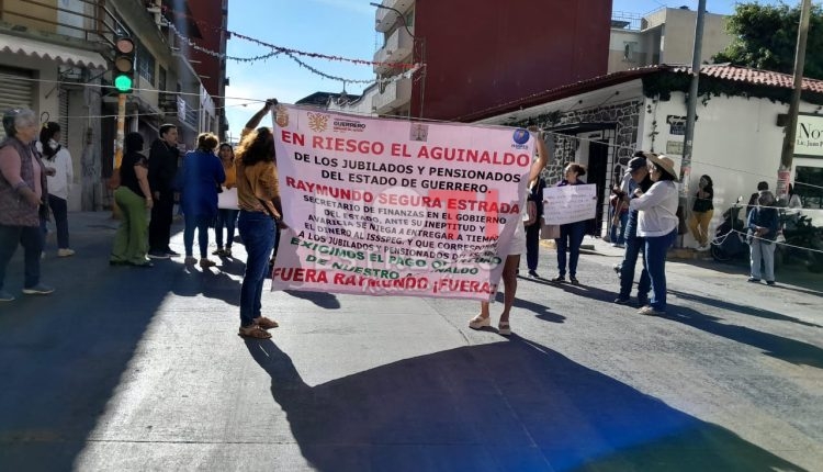 Jubilados y pensionados de Guerrero bloquearon la avenida Juárez esquina Madero, para exigir al gobierno del estado el pago del aguinaldo de 6 mil 400 trabajadores en retiro.