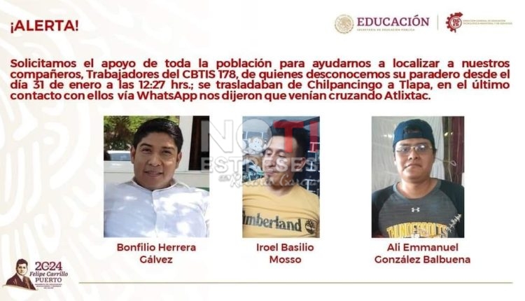 Tras la desaparición de tres trabajadores del Centro de Bachillerato Industrial y de Servicios (CBTis) plantel 178 de Tlapa de Comonfort, personal de esa institución solicitó a través de redes sociales ayuda para la localización de sus compañeros.