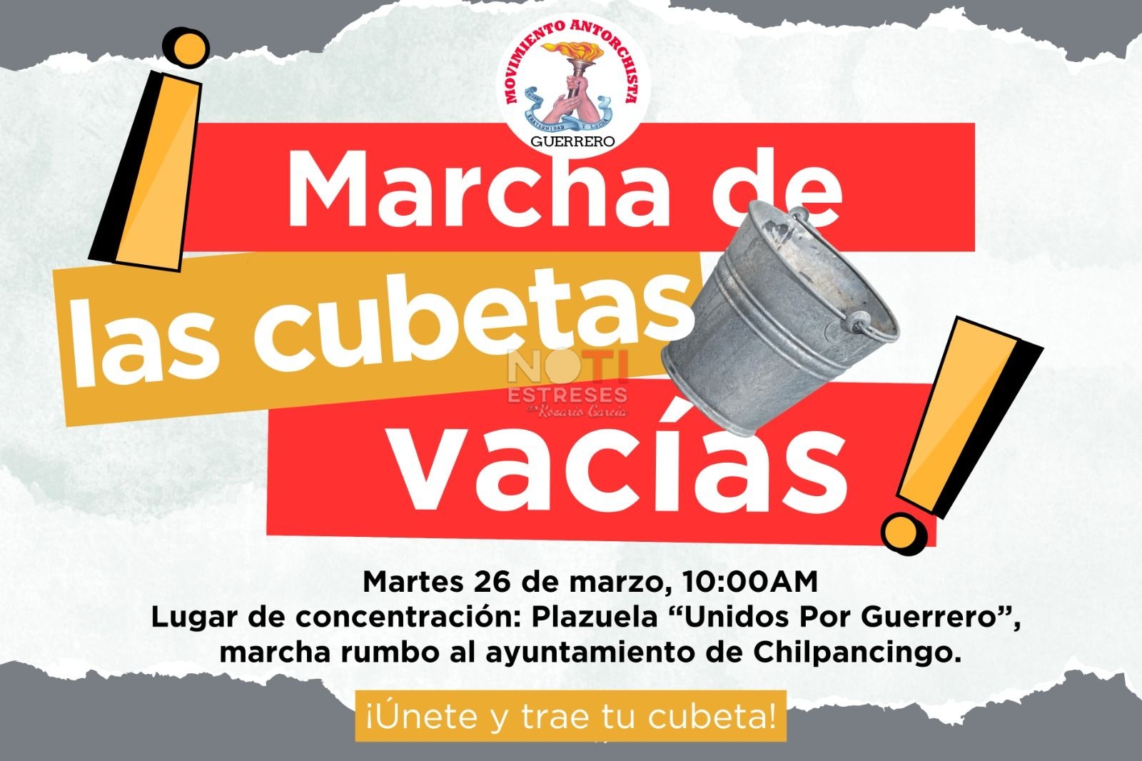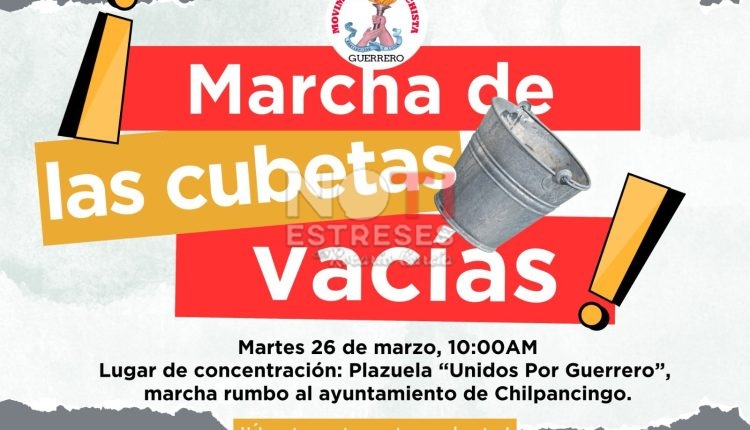 Debido a la situación de escasez de agua que prevalece en el estado de Guerrero, incluyendo las colonias populares, barrios y centro de Chilpancingo, el Movimiento Antorchista convoca a la “Marcha de las Cubetas Vacías”, que se realizará el próximo martes 26 de marzo a las 10 de la mañana.