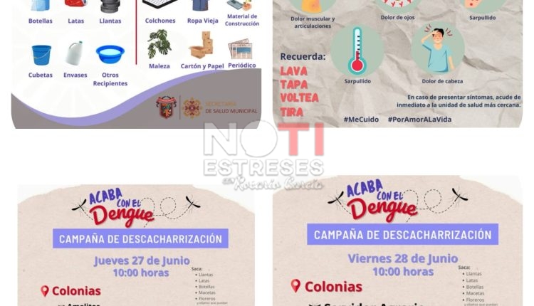 Adelantó que el jueves 27 de junio se llevará a cabo una jornada de descacharrización en las colonias Amelitos, Bella Vista, Lomas de Xocomulco, Obrera y Lomas del Porvenir, y el viernes en la Servidor Agrario, Sedue y Las Torres, en tanto el fin de semana anterior se realizó en la Jardines del Sur.