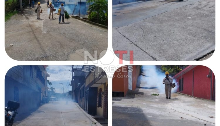 Una brigada de 12 personas del sector Vectores de la Secretaría de Salud del gobierno estatal acudió a la comunidad de Mazatlán a fumigar y distribuir abate a las casas, como parte de la estrategia para contener los registros de dengue, que durante los últimos días tuvo un registro de unos 100 casos.