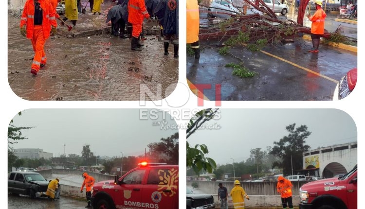 Entre los servicios que fueron atendidos en coordinación con otras dependencias de gobierno, destaca el colapso de un tramo de la barda perimetral de las instalaciones de la 35 Zona Militar, junto al encauzamiento del Río Huacapa, así como un árbol caído en el estacionamiento de la tienda de autoservicio Sams Club.