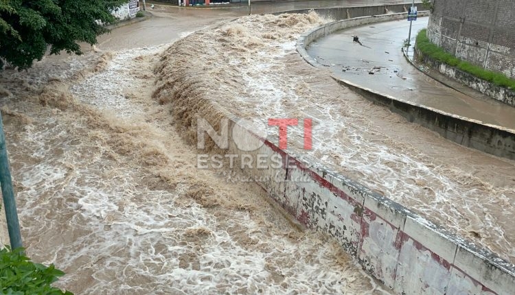 Otra zona que registra muy elevado el nivel del agua es el tramo del encauzamiento a la altura del Palacio de Gobuerno y el Auditorio Sentimientos de la Nación, donde el agua escurre con fuerza y ya se encuentra a poca distancia de salirse de su cauce.