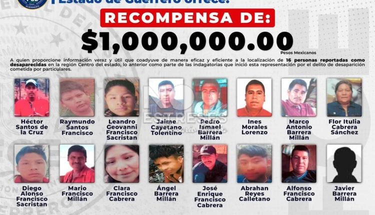 Un millón de pesos es lo que ofrece como recompensa la Fiscalía General del Estado (FGE) a quien proporcione información veraz y útil para dar con el paradero de 16 personas reportadas como desaparecidas en los municipios de Chilapa de Álvarez y Quechultenango.