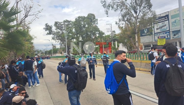 Los inconformes, con uniformes escolares y muchos con los rostros cubiertos, mantienen cerrada la circulación vehicular sobre los carriles centrales de la vialidad federal y el lateral norte-sur del bulevar Vicente Guerrero.
