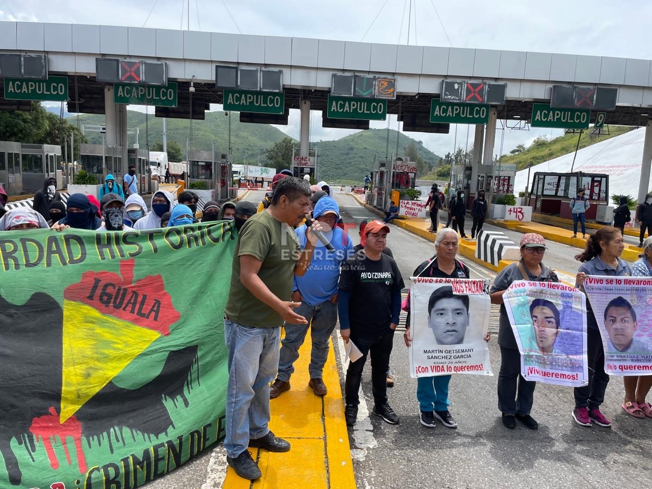 Padres y madres de los 43, así como estudiantes de la Normal de Ayotzinapa y otras normales rurales protestan este día en la caseta de cobros de Palo Blanco de la Autopista del Sol y bloquean parcialmente las vialidades.