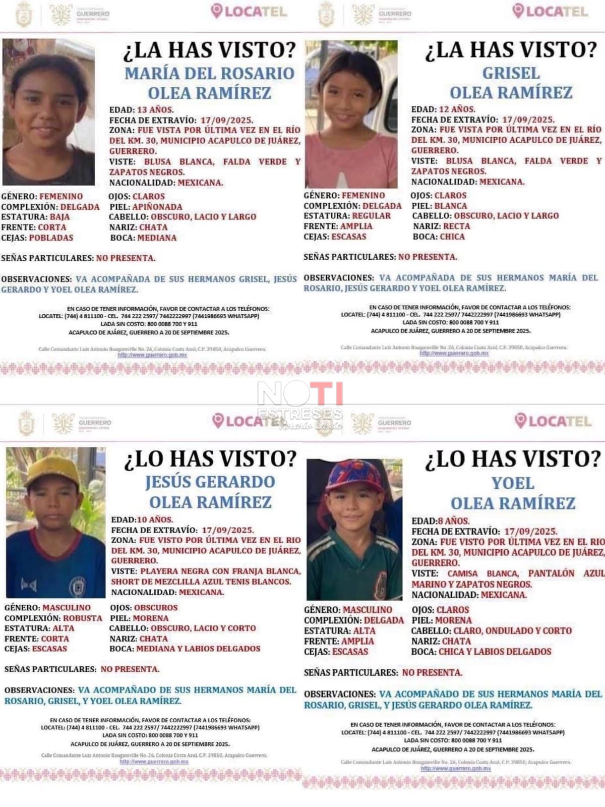 Los menores son María del Rosario, de 13 años; Grisel, de 12; Jesús Gerardo, de 10, y Yoel Olea Ramírez, de 8 años, quienes según la información oficial fueron vistos por última vez en la zona del río de esa comunidad.