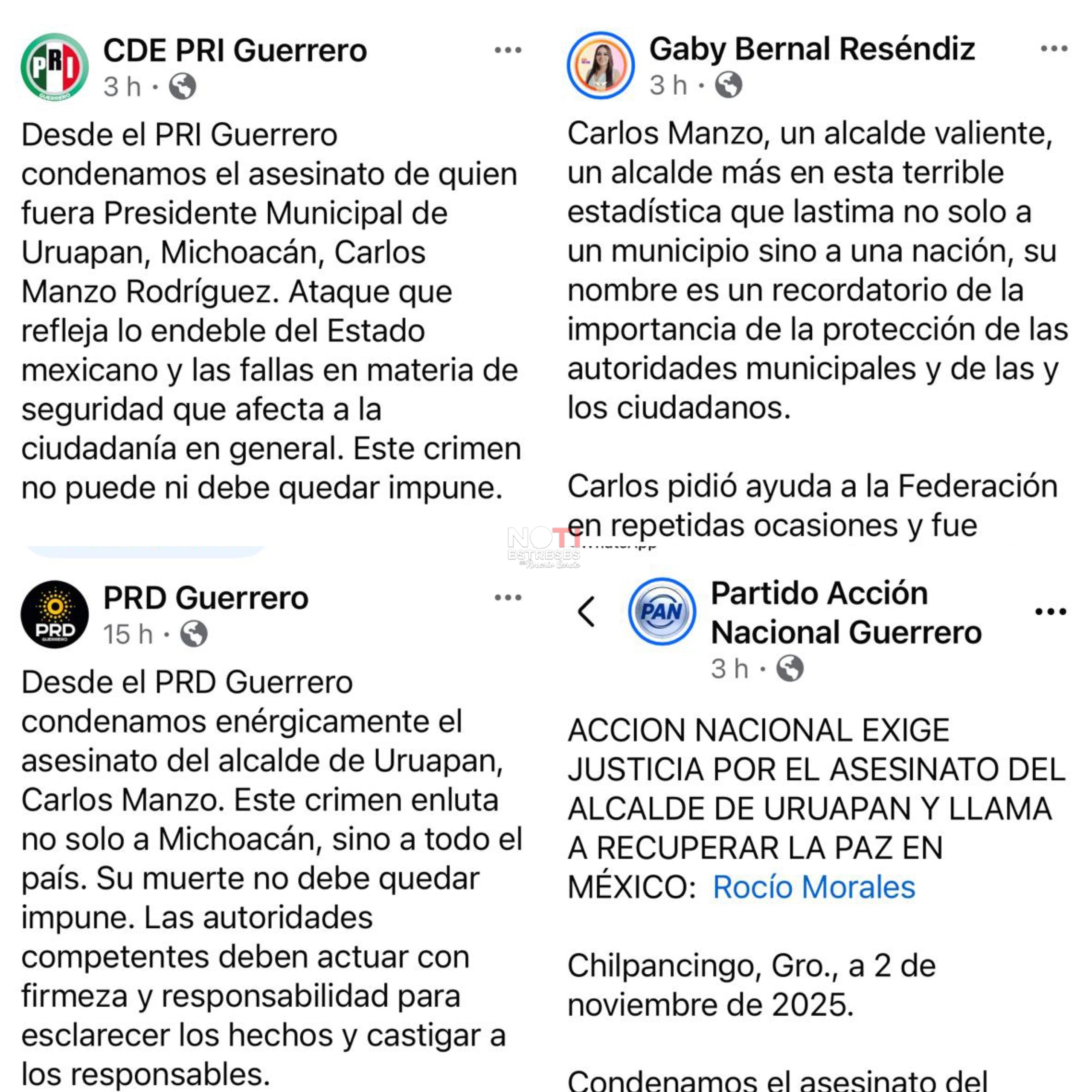 Los partidos PRI, MC, PAN y PRD en Guerrero condenaron el homicidio del alcalde de Uruapan, Carlos Manzo Rodríguez, ocurrido en Michoacán, y exigieron justicia inmediata.