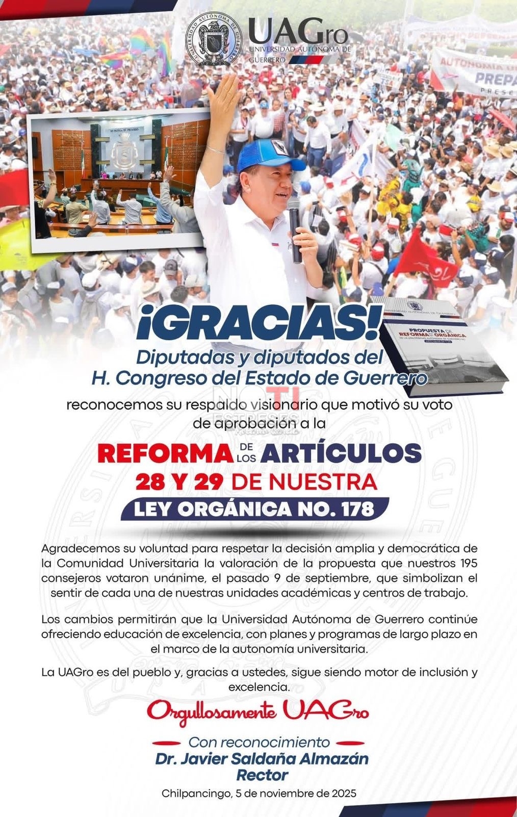La Reforma aprobada busca fortalecer la estructura y el funcionamiento académico de la Universidad Autónoma de Guerrero, impulsando políticas orientadas a la excelencia educativa, la investigación y la formación integral de estudiantes y docentes.