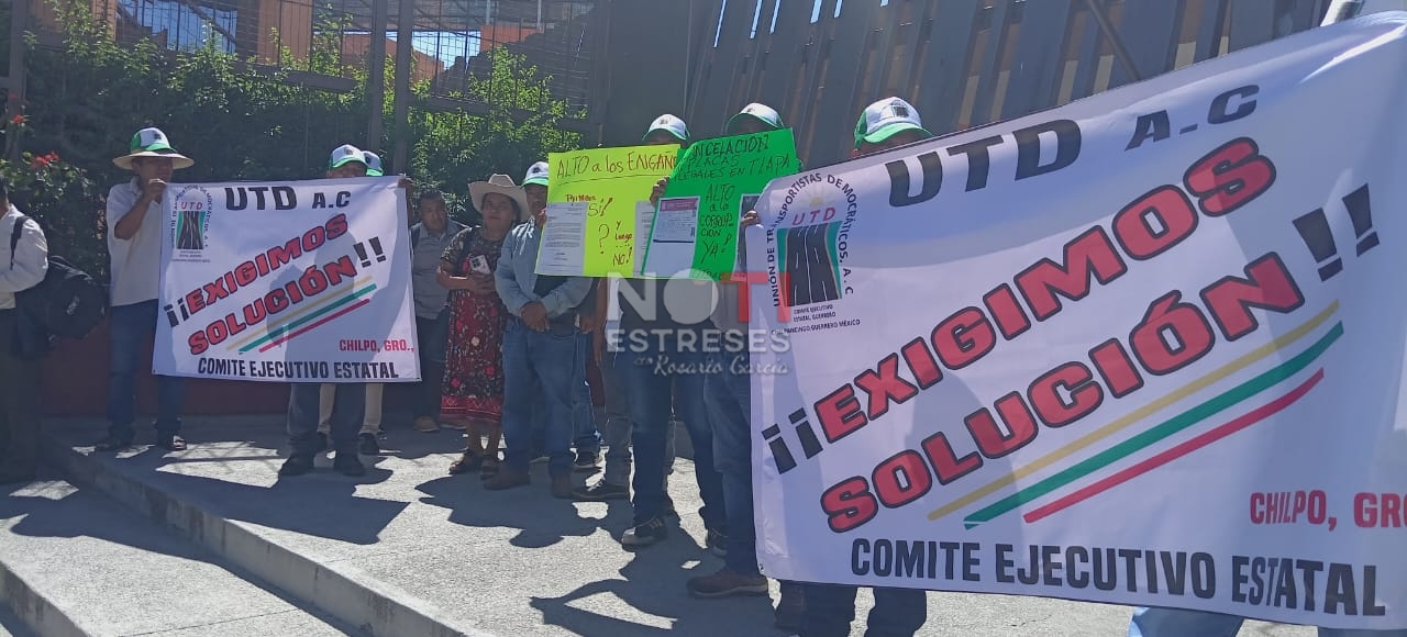 Integrantes de la Unión de Transportistas Democráticos (UTD) se manifestaron este jueves en el acceso principal del Recinto Oficial del Poder Ejecutivo de Guerrero, para exigir la entrega de más de 100 permisos de trabajo, de los cuales 35 corresponden a la región de La Montaña.