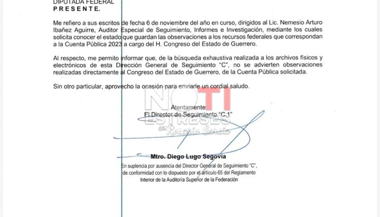 La Auditoría Superior de la Federación (ASF) aclaró que no existen observaciones ni señalamientos pendientes de solventar respecto a la Cuenta Pública 2023 del Congreso del Estado de Guerrero, periodo en el que fungió como presidenta de la Junta de Coordinación Política (JUCOPO) la diputada Yoloczin Domínguez Serna.